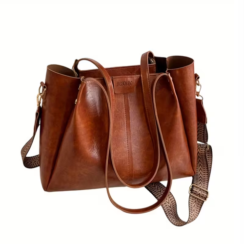 エンボス加工レザーハンドバッグ - ブラウンアクセント